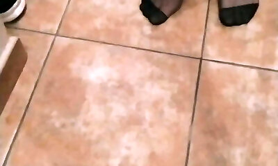 Accidental black nylon foot wank!