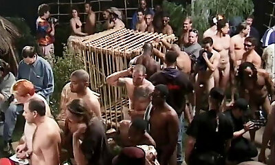Busty ebony whore gets her honeypot banged hard by many dicks