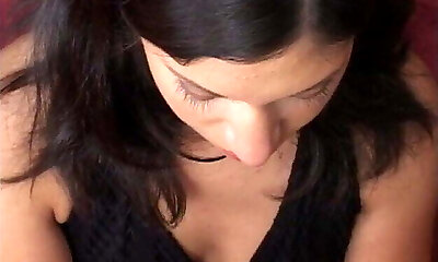 Big breasted sexy babe in black lingerie bows to impress stud with a oral pleasure