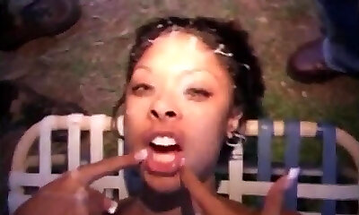 Blowbang, Cunnilingus and Bukkake for a petite ebony girl