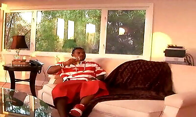 Wrinkled long-legged black head in glasses Theresa Soza pets her own wet pussy