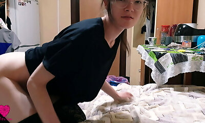 Petite Titted Brunette Wih Hefty, Black Glasses Is Riding A Rock Hard Meat Stick And Enjoying It