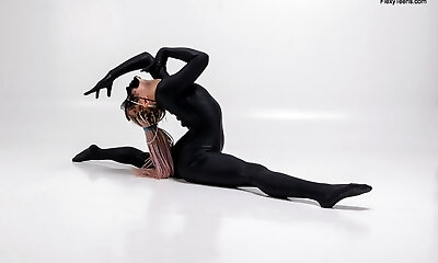 Hot gymnast with braids Lola Kauchuk clothed in latex